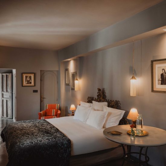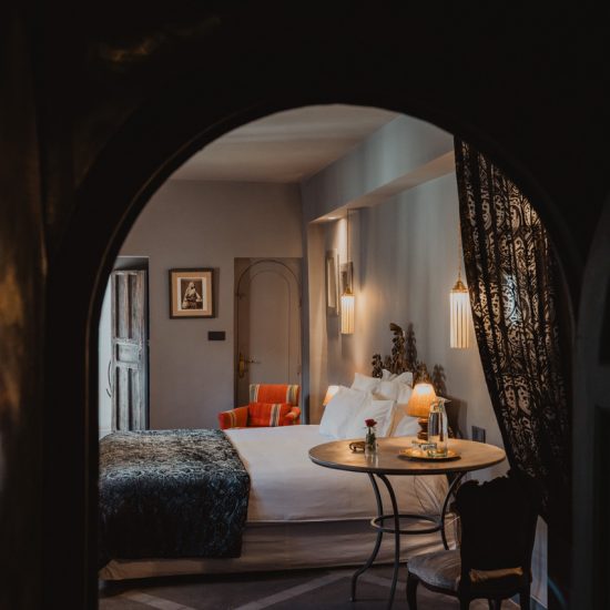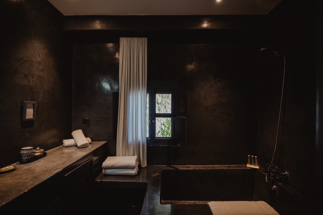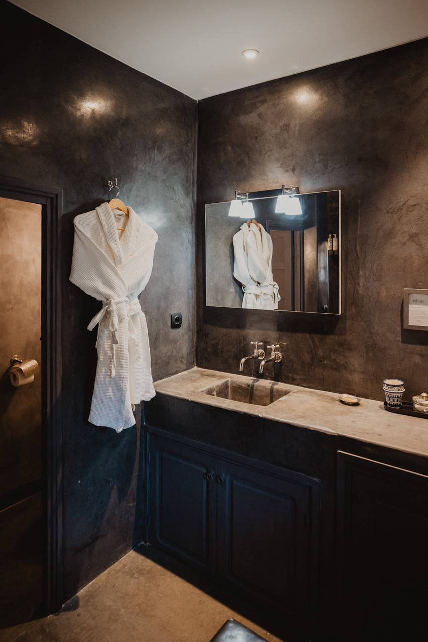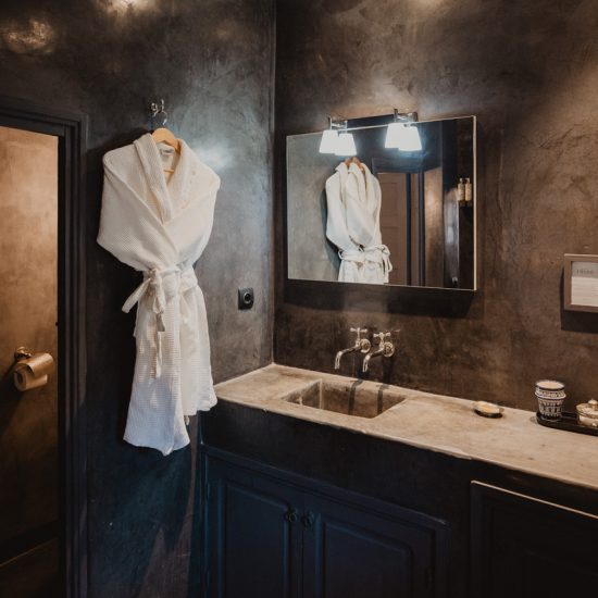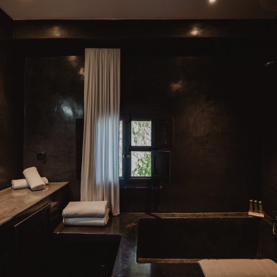 The suite Douiria is a double room located on the 2nd floor overlooking the patio. Former master home of the riad, this beautiful suite won’t let you indifferent. The dark tones bring sobriety to the room and plenty of natural light comes in from the windows. The suite features a king size bed, a seating area with 2 armchairs and a table. On request the king size bed can be converted in 2 single beds, and we can add an extra single bed. A particular detail of this suite is a carved wood wall created by a moroccan craftsman. The grey tadelakt bathroom is really comfortable and features a bath, a shower and double sinks. Separate toilet.