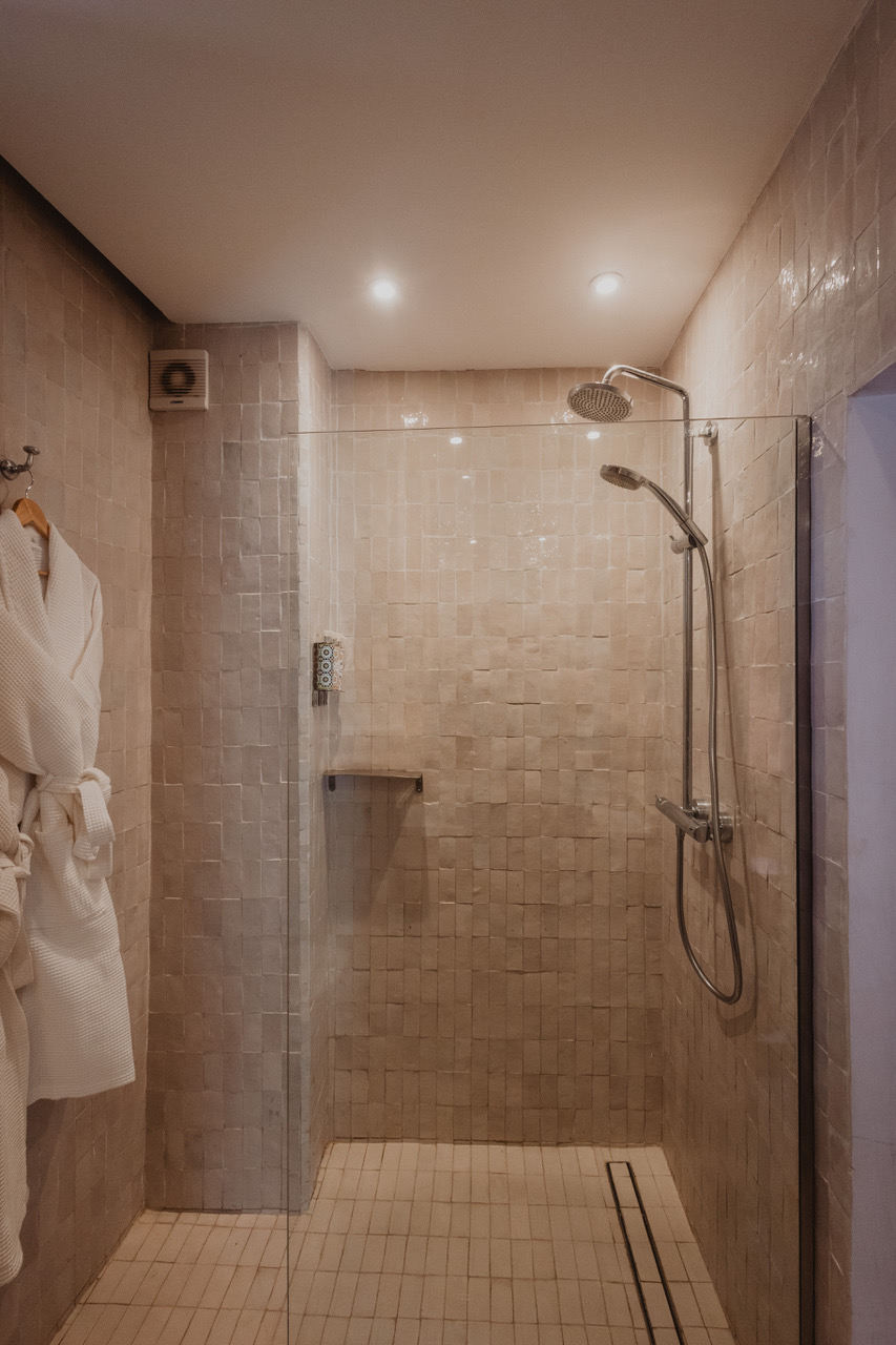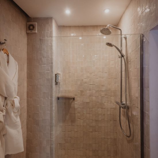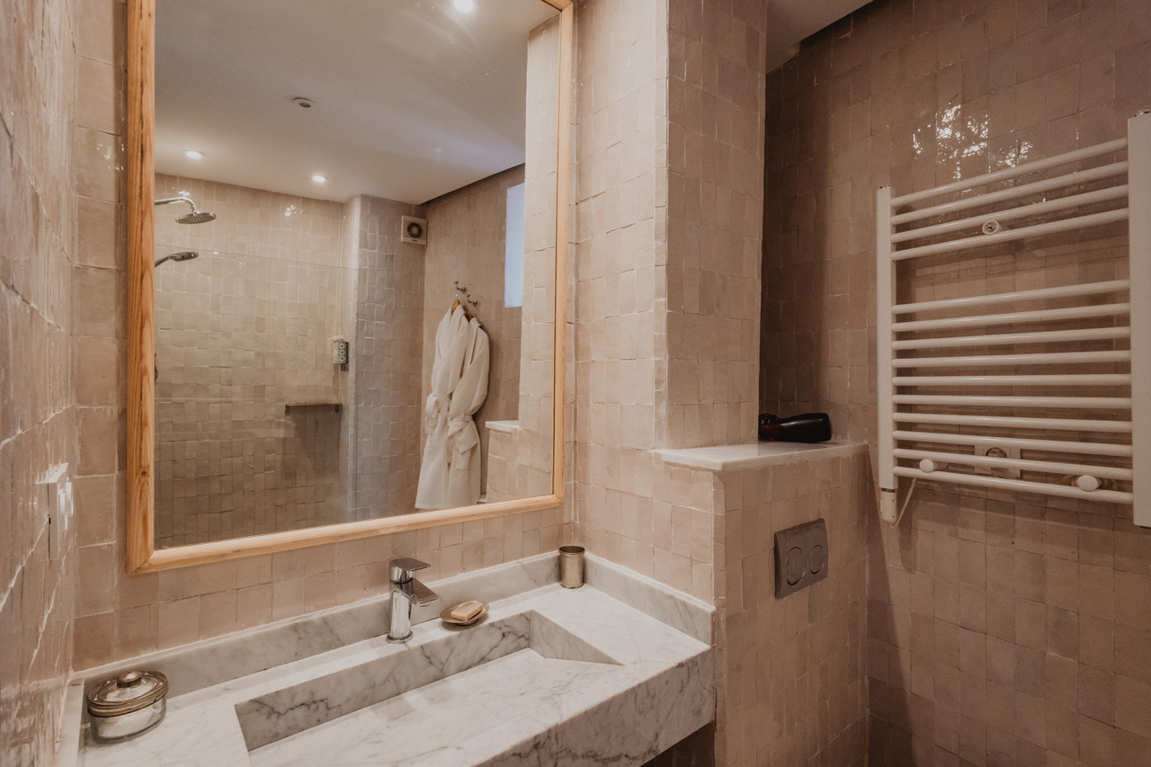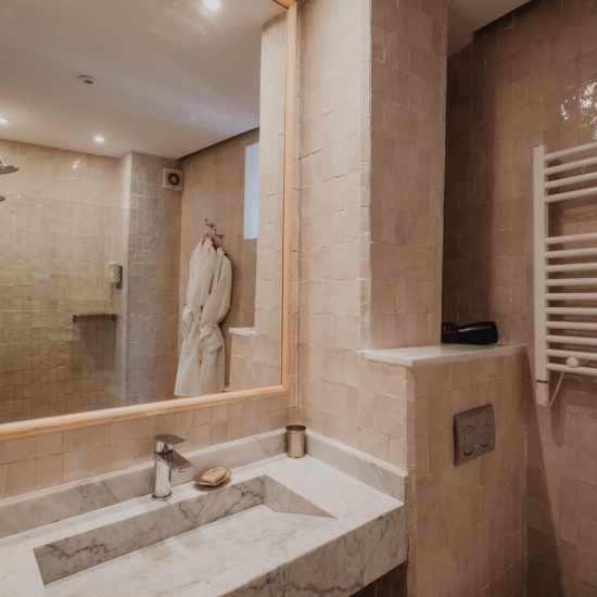 La suite Nour est située au 2ème étage, avec vue sur le patio. Cette suite captive par sa couleur chaude et sa mise en scène qui vous absorbe. Si vous souhaitez un espace feutré et confortable, cette suite est la vôtre. Elle dispose d’un lit king size, sous un petit puits de lumière, d’un salon équipé de deux canapés syriens et d’un petit bureau. Si la suite convient parfaitement aux amoureux, elle peut également accueillir un petit enfant, les canapés pouvant se transformer en lits douillets (1,70 m de long). La salle de bain en zellige blanc cassé est composée d’une douche, et d’un lavabo et WC.